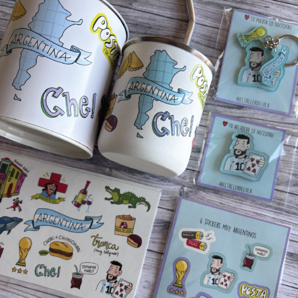 KIT SOY ARGENTINO (1 MATE + 1 LLAVERO + 1 IMAN + 1 SET DE STICKERS + 2 POSTALES)